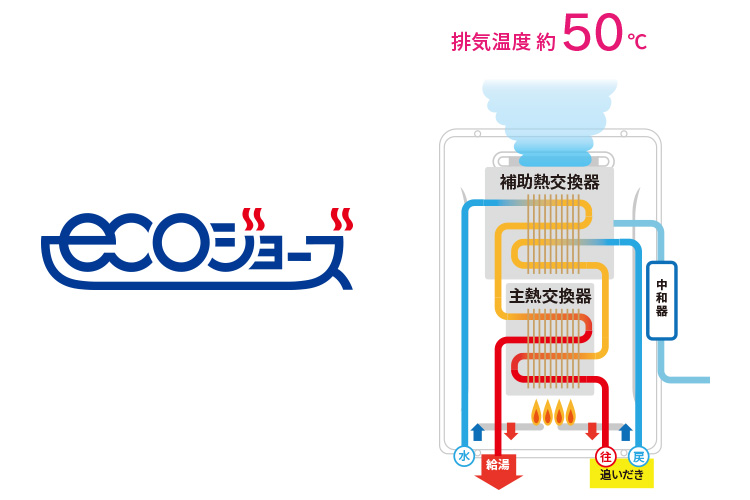 「エコジョーズ」は、従来捨てていた排気熱を回収して再利用するガス給湯器です。熱効率を96%まで高めて、ガスの使用量を節約し、CO2の排出量を削減する、家計にも環境にも負担が少ない経済的なガス給湯器です。