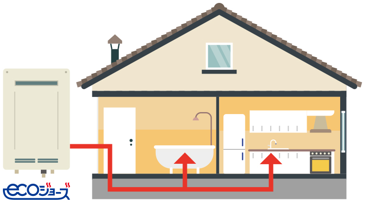 1台で浴室・シャワー・洗面所・台所へ給湯。
